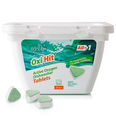 Inovativní koncentrované Tablety do myčky s aktivním kyslíkem odstraňují odolné skvrny z nádobí i v krátkém mycím cyklu (při nízké teplotě) a obsahují dezinfekční prostředek pro hygieničtější výsledky.